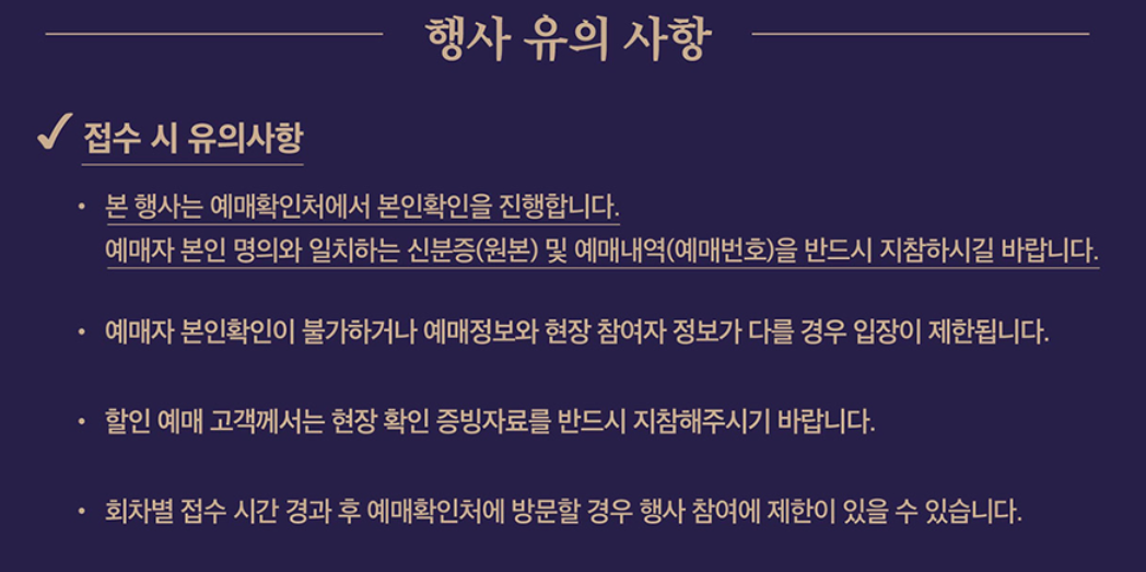 - 예매: 8월 27일(수) 오후 2시, 티켓링크에서 잔여석 일반 예매! (1인 2매, 3만원)