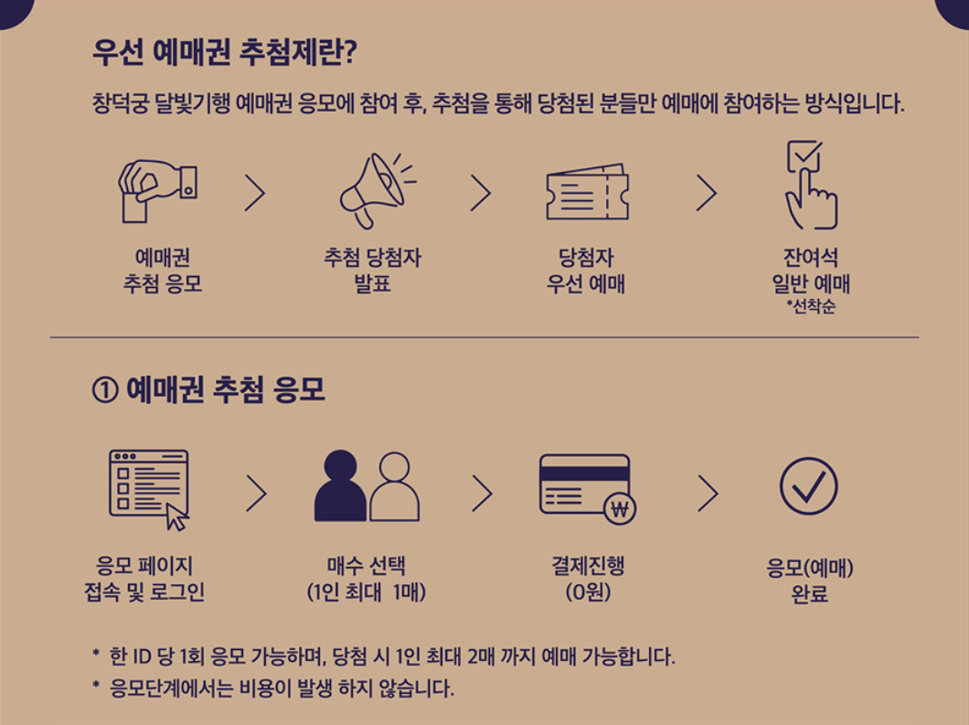 창덕궁 달빛기행은 예전부터 '피켓팅'으로 유명했죠? 2025년 하반기 예매는 '예매권 추첨제'와 '일반 예매' 두 가지 방식으로 진행됩니다. 예매권 추첨제는 이미 8월 19일(화)에 응모가 마감되었지만, 실망하긴 일러요! 추첨에서 당첨되지 않거나 미결제된 좌석은 일반 예매로 전환되거든요.