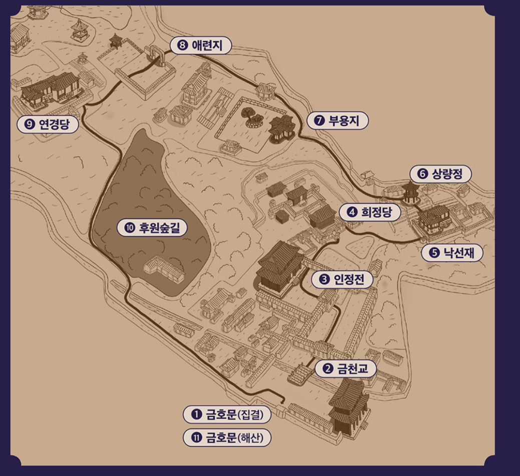 달빛기행은 약 100분간 전문 해설사와 함께 진행되는 알찬 프로그램이에요. 단순한 야간 관람이 아니라, 각 장소에 얽힌 역사 이야기를 듣고 전통 공연까지 즐길 수 있다는 게 정말 매력적이죠. 코스는 다음과 같이 진행돼요.